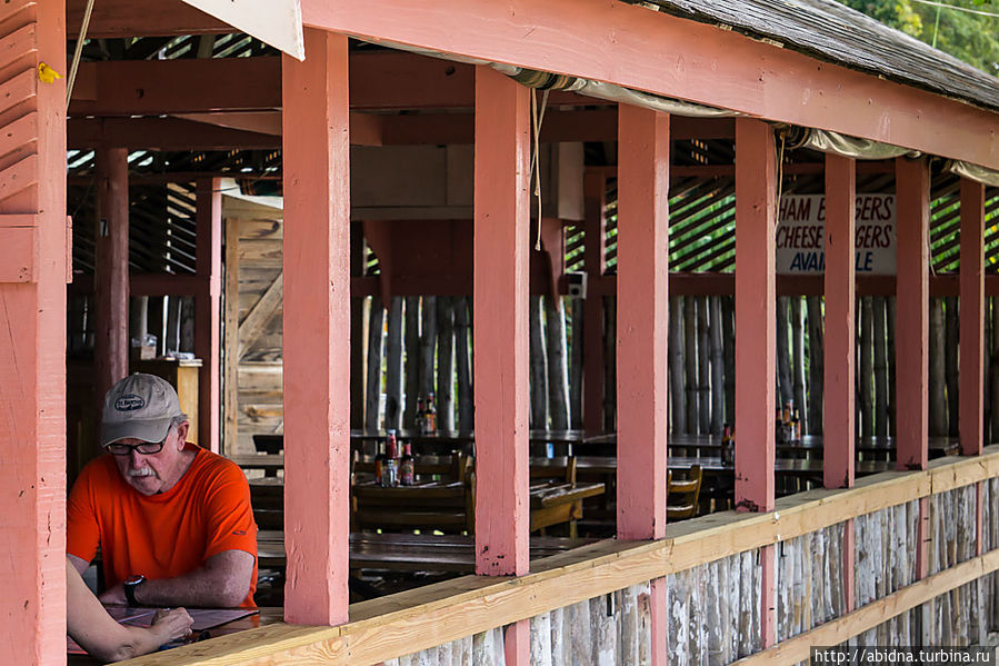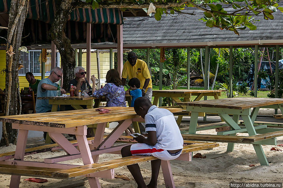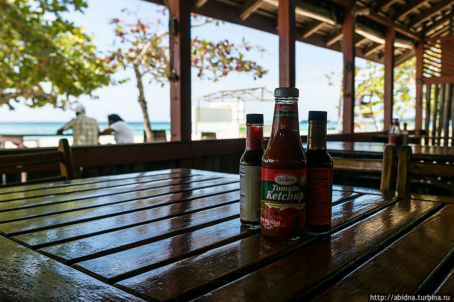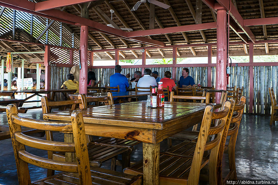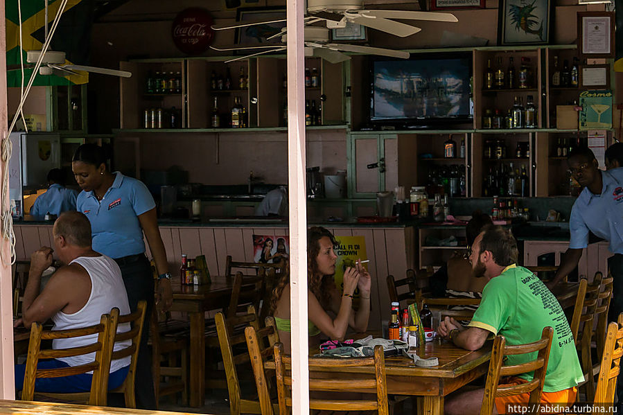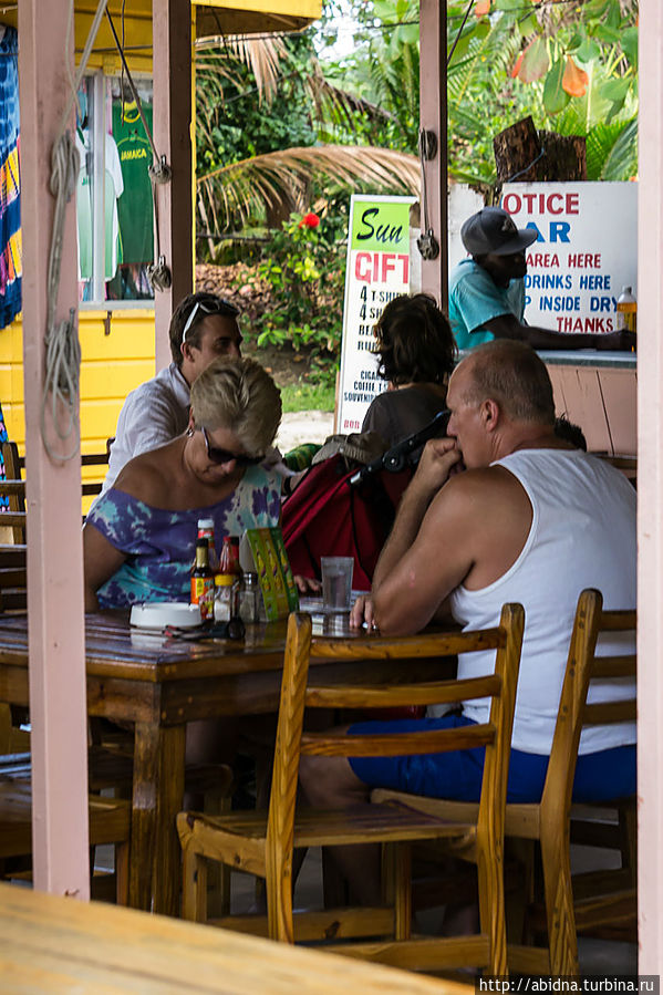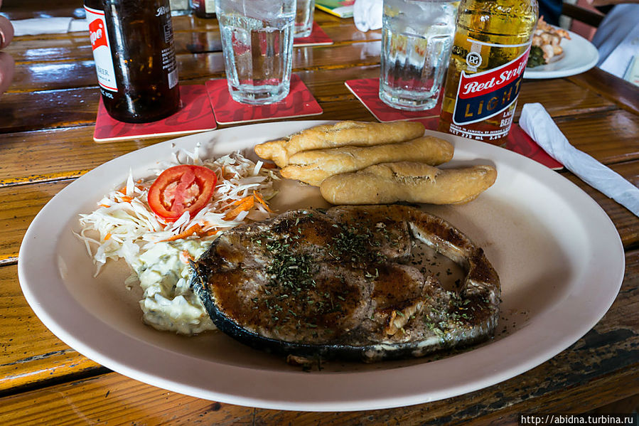 Ямайские отели вряд ли поразят видавшего доминиканские "оллинклюзивы" бывалого туриста, здесь выбор блюд гораздо скромнее, даже в дорогих отелях. Зато все качественное и достаточно вкусное. Тем не менее, однажды у нас в программе не был предусмотрен обед, и мы заехали перекусить в местное кафе. Располагалось оно прямо у моря. Оказалось, туристов здесь было больше, чем местных. Заказали, конечно же, рыбу — а чем же еще питаться, находясь на побережье? К рыбе мне предложили гарнир "фестиваль", о котором я уже упоминала, рассказывая про