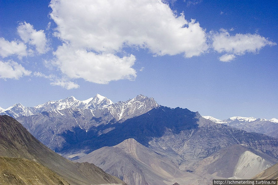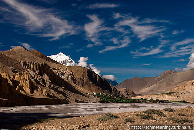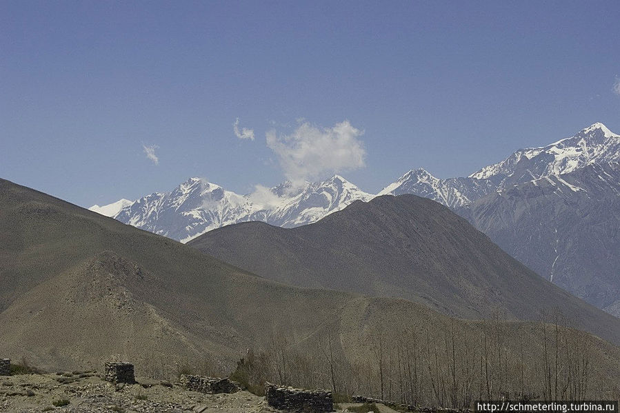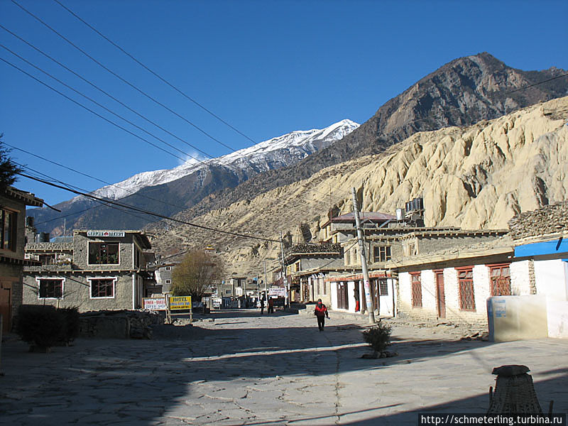 То, что мы успели увидеть за один короткий вечер, было удивительно. Деревня Джомсом на высоте 2713 метров считается административным центром Королевства Мустанг, «затерянного тибетского королевства». Здесь взору открывается совсем другой Непал. Нижний Мустанг — это огромные безлесые горы, похожие на песчаные дюны. Видны заснеженные пики Нилгири и Даулагири. Пейзаж уныл, пылен и загадочен.