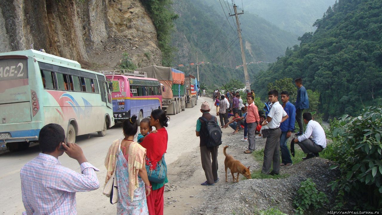 Наконец полицейские дали команду ехать и все рванули вперёд.Водитель спешил быть впереди, так что некоторые пассажиры запрыгивали в автобус на ходу. Но радовались мы недолго, за 3 км до аварийного места колонна снова остановилась. Повторился обвал. Мы начали понимать, что в Лумбини мы сегодня с таким успехом не попадём. На этот раз мы застряли на горной дороге над рекой, в живописном месте.