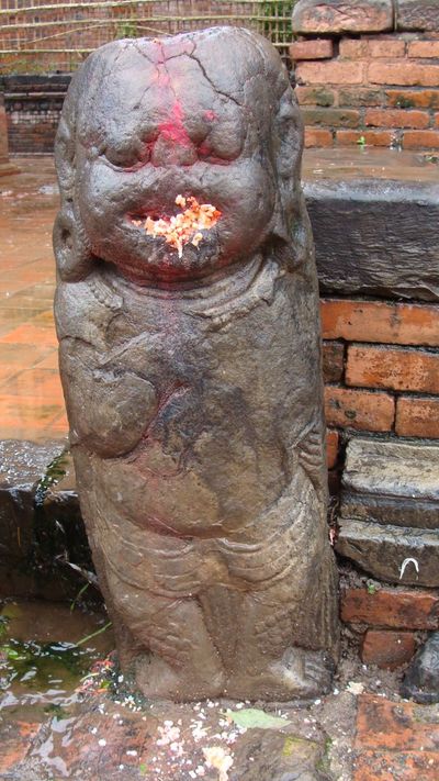 Внутри старого города полно храмов, ступ, статуй Будды и старинных кирпичных зданий. Храм Даттатрея, построеный со ствола одного дерева королём Якша Малла ещё в 1427 году, украшен изображениями совокупляющихся пар. Статуям идолов верующие напихали в рот еды, которую потом едят куры и козы. Мы зашли во двор небольшого храма, чтобы понаблюдать, как одни женщины вили верёвки, а другие сжигали их, принося в жертву. Ещё одна девушка на земле сжигала десятки свечей. Саша решил ей в этом помочь, что вызвало улыбку девушки.