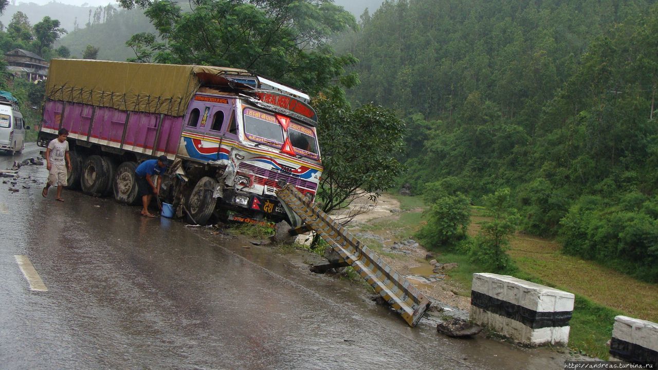 Дорога была трудной, но самым сложным оказалось выехать из Катманду. Приблизительно 2 часа мы ползли в пробке, бус иногда цеплял днищем дорогу на ямах. В пути были аварии: грузовик висел над пропастью после лобового столкновения, а легковую машину так вообще вытаскивали из пропасти с помощью лебёдки. Видели разбитый грузовик, который завалил камнепад. Интересно, что водители обложили место аварии камнями и регулировали движения до приезда полиции. Также мы переезжали по воде затопленный участок дороги и перебирались по грязи после свежего оползня.