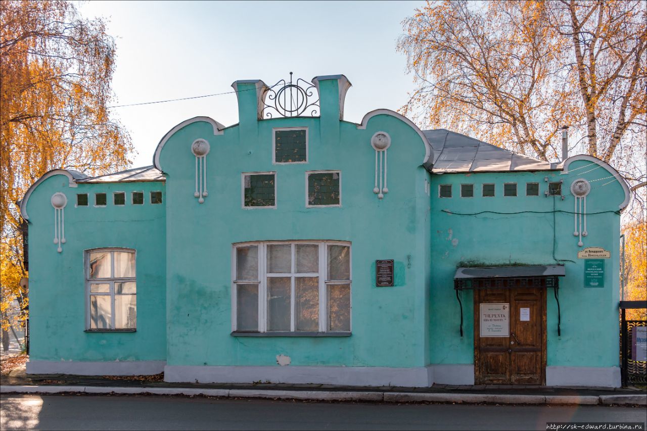 Тем временем, проходим местный краеведческий музей. Здесь, наверное, не ошибусь, если скажу, что на музей это приземистое зелёное здание похоже в последнюю очередь. И отчасти это правда: изначально, со времён постройки в начале 1900-х годов оно использовалось под частную аптеку, и уже гораздо позже его передали под размещение местной музейной экспозиции. Сама экспозиция небольшая, основанная в основном на дневниках уроженки Нерехты писательницы Елизаветы Дьяконовой, удивительной и образованной женщины с трагической судьбой: