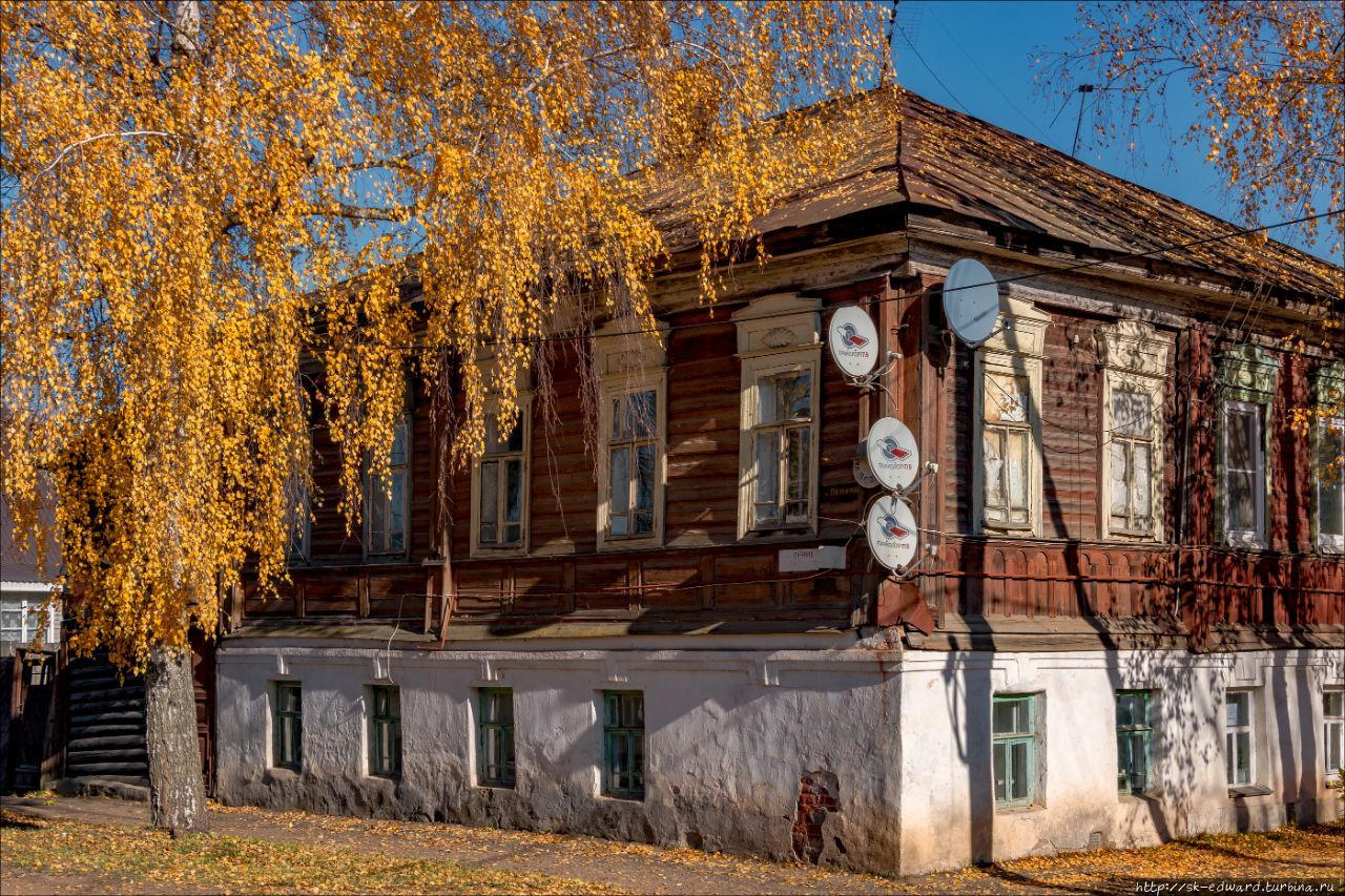 Здесь что ни дом, то нежный привет из XIX века, из тихого купеческого города, жившего той жизнью, которую нам уже очень трудно себе представить. Особенно бросаются в глаза вот такие крепкие деревянные дома на каменном основании. Интересно, что раньше, в XVIII-XIX веках, хозяева и домовладельцы жили исключительно на верхних, деревянных этажах, а хозяйственные пристройки и помещения для обслуги располагались на первом этаже, который выкладывали из камня. Как ни крути, а наши предки знали толк в комфорте: