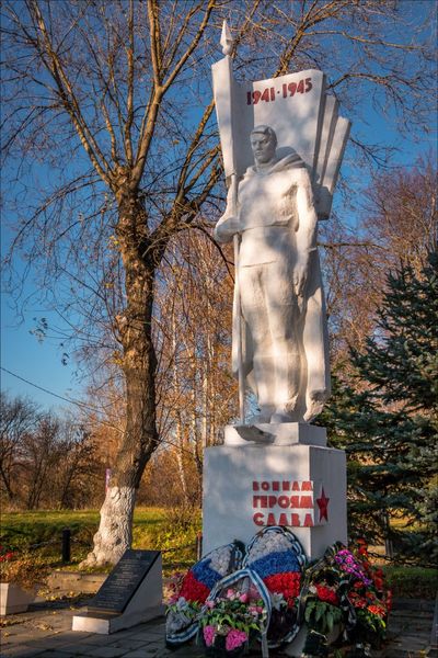 Мемориал, надо отметить, в очень добротном исполнении. Единственное, что немного расстроило — это то, что выставленный напоказ самолёт как-то не очень вяжется с темой войны 1941-1945 годов. Всё-таки, во-первых: модель эта не наша, не отечественная (чехословацкий Аэро Л-29 «Дельфин»), а во-вторых, серийный выпуск её датируется уже спустя 16 лет после капитуляции Германии, т.е. в 1961 году.