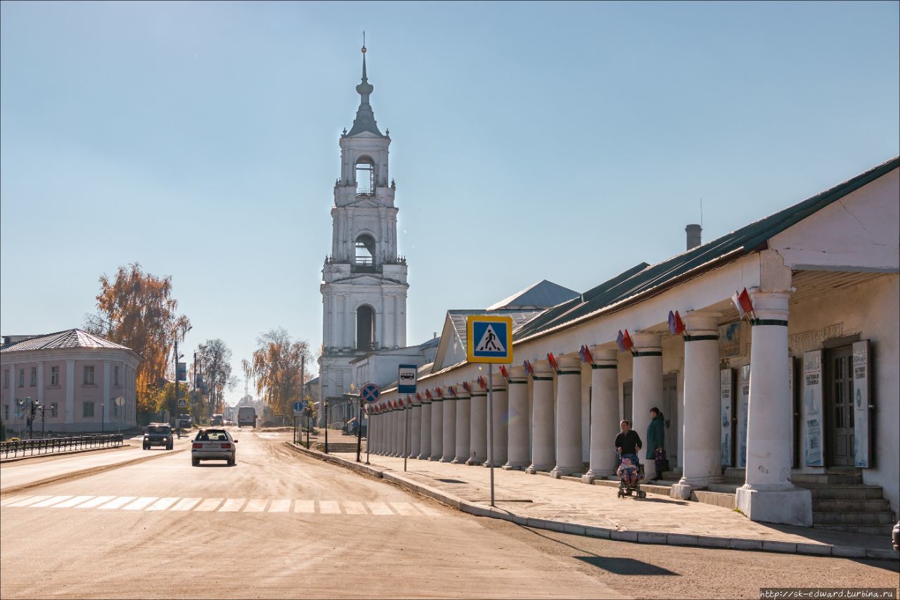 Другое заметное сооружение центральной площади, которое, к слову, носит гордое имя Свободы — это Гостиные (или Торговые) ряды, построенные в 1836 году по проекту Петра Фурсова, архитектора знаменитой пожарной каланчи в Костроме: