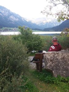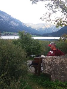 Мы заплатили курортный взнос и хозяйка нам выдала проездной на местный автобус, на нем мы доехали до Халлера — приозерного райoна. В Халлере всего несколько жилых домов, но есть большая фешенебельная гостиница с рестораном прямо на берегу озера. От этого отеля начинается прогулочная тропа вокруг озера Хальдерзее, заканчивающаяся в часе ходьбы на противоположном берегу в зоне купания. В сентябре там конечно уже никто не купается, но там есть пиццерия и рыбный ресторан, в пруду которого обитает живая форель.