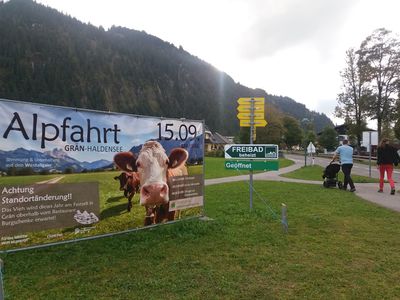 Эта часть озера уже принадлежит к другому поселку — Хальдерзее. он покрупнее Нессельвенгле, в нем есть отели, рестораны, супермаркт и кондитерская, которую я очень рекомендую к посещению. Недалеко от кондитерской мы увидели рекламу Альптриба (или Альмабтриба) — праздника возвращения скота с высокогорных пастбищ, он должен был состояться на следующий день.