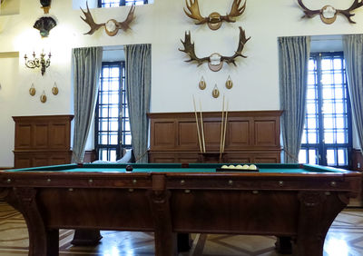 У меня дома в бильярдной тоже висят "трофеи"... Но в моем случае это шарфы с посещенных футбольным матчей и туристические сертификаты (об плавании во льдах Антарктиды, об покорении Килиманджаро и Меру, об погружении с аквалангом в Шри-Ланке и др.)