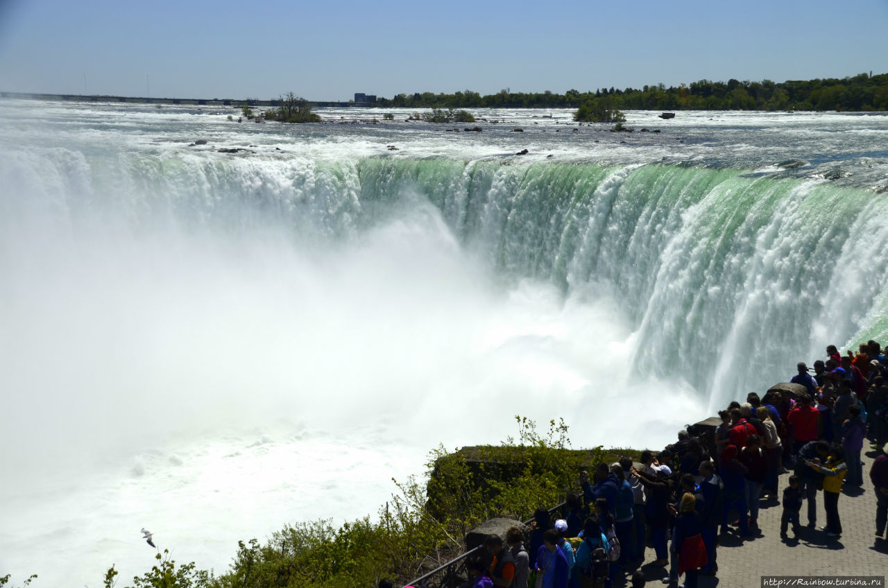 Зато потом, срываясь вниз эти бесконечные кубометры воды, образуют стену, вернее гиганскую водяную подкову. Это зрелище настолько грандиозно, настолько впечатляюще, настолько красиво, что от него невозможно оторваться в течении длительного времени. Действительно, не зря в отзывах туристов постоянно мелькает мысль, что вид на Ниагарские водопады с канадской стороны намного более впечатляющий и более грандиозный, чем с американской. Счастливы те, кто может это увидеть в обеих стан, сравнить и впечатлиться.