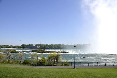 Всю "Подкову" увидеть с американской стороны можно, но ракурс здесь немного боковой. Зато очень хорошо ощущается мощь водопада. Также отсюда, с американской стороны, открывается хороший вид на канадский одноимённый город, расположенный на противоположном берегу.