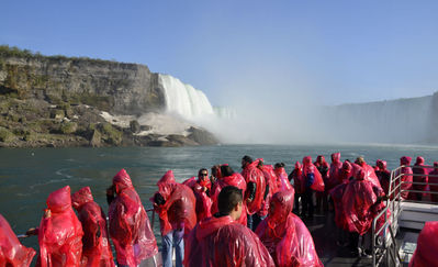 Полноту ощущений размера и мощи водопада приносит вид на кораблик, который везет туристов прямо к подножью водопада. Красный кораблик с туристами в красных плащах-накидках — это канадский.