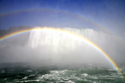 Становится немного страшно. Сила, которая перед нами, огромная. Кажется, что она может поглотить нас. Но, вплывая в этот столб, даже не в сам водопад, иначе бы наш кораблик просто захлестнуло и он бы перевернулся, ощущаем огромный прилив энергии и восхищение. Такая радость нахлынула! Кругом брызги, водяная завеса и через нее светит радуга. Она огромная, она двойная, она везде. Мы вплыли прямо в радугу!!! От восхищения я забываю про все, осторожно достают камеру и делаю этот кадр. Он самый ценный для меня, он сделан прямо в водопаде. Это нечеткость снимка — это водяные брызги Ниагары, это её mist, это снимок её души.