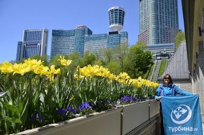 Спускаясь, проходим небольшой мостик, ведущий к набережной. На минутку останавливаемся, вдохнуть аромат весенних цветов и сделать фото с флагом Турбины на фоне современных отелей. Та круглая башня за моей спиной — это наш отель, в котором мы ночевали. На одном из этажей есть ресторан, из огромных окон которого открывался прекрасный вид на вчерашнюю вечернюю подсветку и фейерверк.