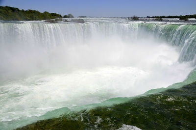 На американской стороне сразу идем к самому большому водопаду "Подкова". Везде полно указателей и скопление людей не даст ошибиться, но есть еще кое-что, по чему можно безошибочно определить его местонахождение. Это огромный водяной столб парящий над водопадом, так называемый mist. Это мельчайшие водяные брызги, образуемые любым водопадом. Здесь же они, из-за огромных размеров водопада образуют огромный столб размеров несколько метров.