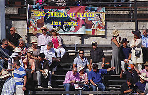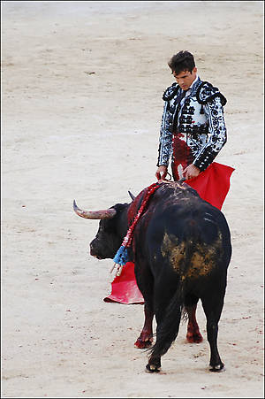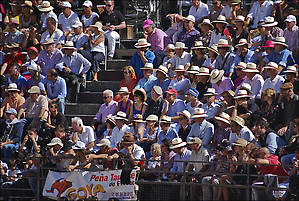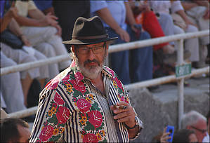 Арена в Ниме похожа на разрезанную пополам дыню торпеду. На «галерке», на самых дешевых местах сидят обычно самые отвязанные афисьонадос — и местные, французы, и из множества испанских провинций, включая принявшую анти-корридные законы Каталонию, латиноамериканцы (а на местах для почетных гостей был замечен нобелевский лауреат Варгас Льоса, роман которого «Тетушка Хулия и писака» был настольной книгой моей юности). Иногда с трибун «заряжают» что-нибудь духоподъемное.