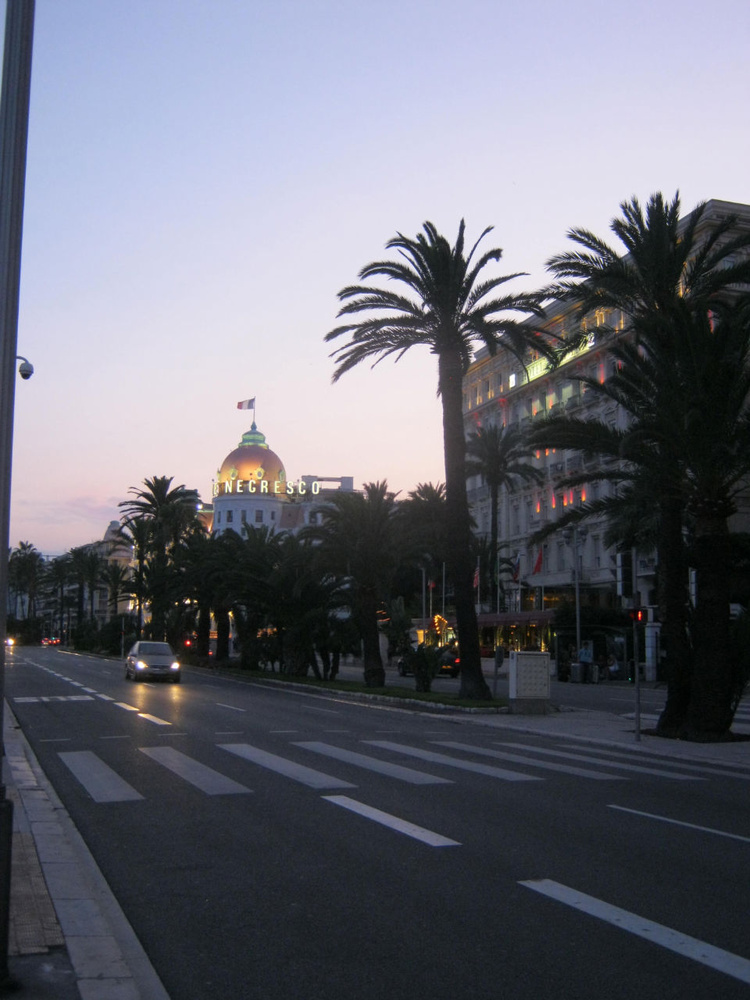 Начинает темнеть. Рядом с нами ребята сворачивают парапланы. Мы идем гулять по Английской набережной. La Promenade des Anglais – визитная карточка Ниццы. Вечером набережная, как и в любом курортном городе, заполняется праздно шатающейся толпой. Мы представляем, как прогуливалась здесь русские аристократы в 19 веке… Романтический настрой немного сбивают пролетающие в нескольких сантиметрах от нас велосипедисты. Ну конечно! С непривычки мы не обратили внимания на то, что шагаем прямо по велосипедной дорожке.