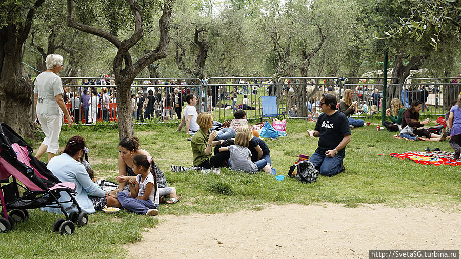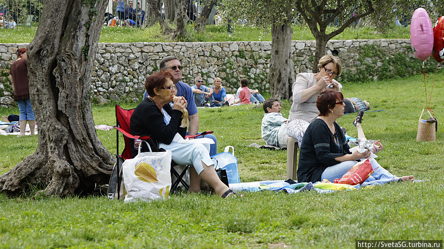 народ приходит семьями, расстилает коврики на травке, достает продукты и напитки для пикника