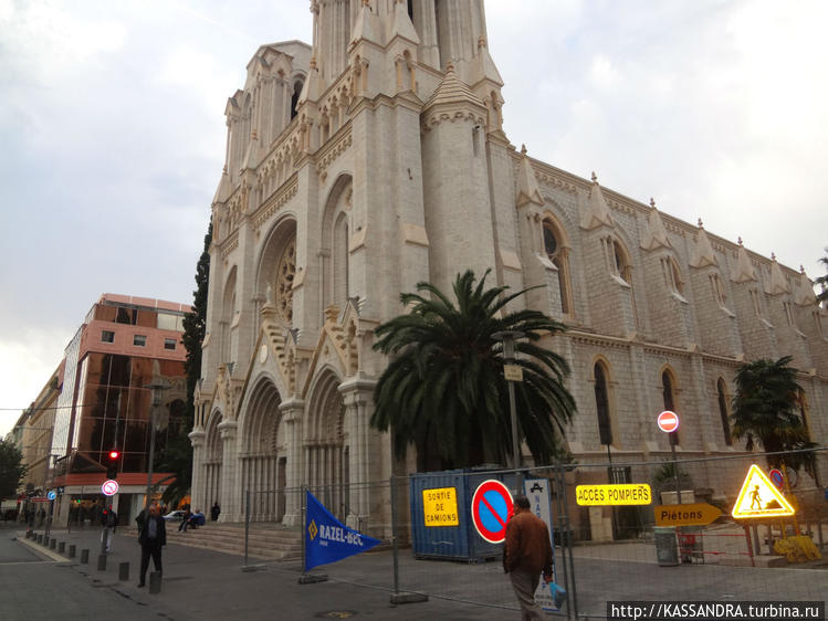 Первое, что сделали мы в Ницце-прошлись по хорошо знакомому нам бульвару. По этой центральной улице мы "намотали" сотню километров в наши прошлые посещения Ниццы. От своего отеля мы выходили на бульвар напротив самой большой церкви в Ницце — Нотр Дам. Затем недолго, как нам казалось, шли к морю.