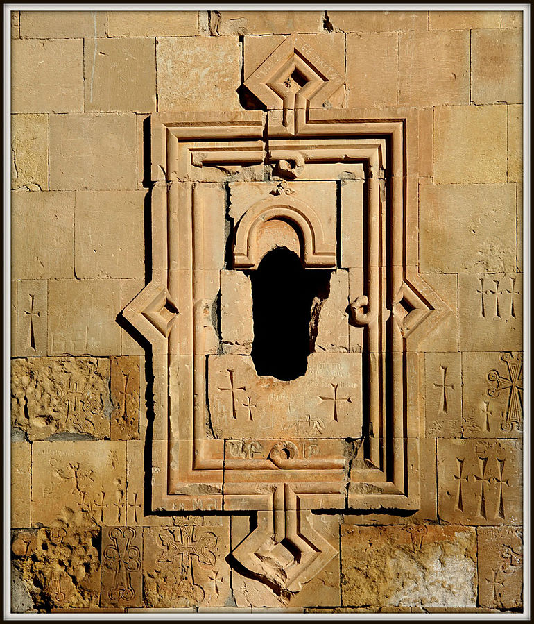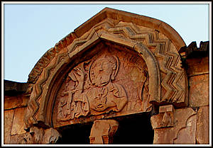 Стрельчатый тимпан однотипного окна над дверью церкви Сурб Карапет украшен уникальным барельефом с изображением Господа с большими миндалевидными глазами. Правой рукой Он благословляет Распятие, а левой держит голову Адама с парящим над ней голубем, символизирующим Святого Духа. В правом углу тимпана – голубь-серафим, а пространство между ним и фигурой Господа заполнено письменами.