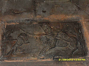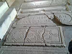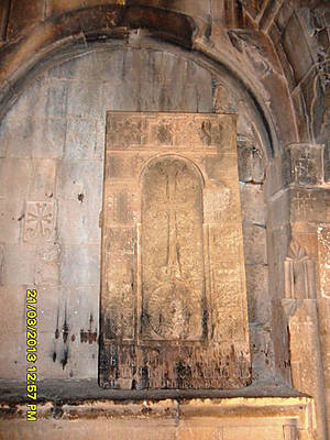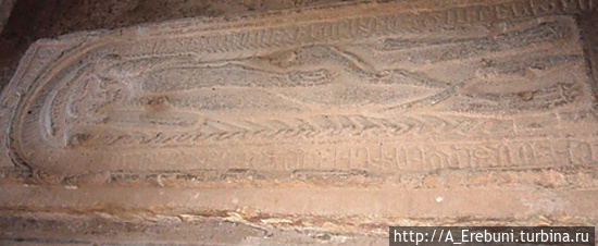 Особого внимания заслуживает могильная плита в Часовне св.Григория — на ней высечено очень необычное изображение человека-льва. Льва, символа князей Орбелянов. Лев худ и долговяз, меня он напугал невыносимо, похож на нечто, кому не место в христианском храме и кого назвать никак нельзя. Говорят, когда наступает ночь и в ущелье спускается мгла,