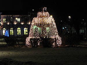 Прибыли мы сюда совсем под вечер, когда уже основательно стемнело. С одной стороны это обстоятельство практически исключило возможность осмотра достопримечательностей, но с другой — подарило нам сказку, так как нарядно подсвеченный город производил впечатление! Здесь не экономят на подсветке, что для Скандинавии скорее необычно. Так что мы не удержались и побродили по вечернему городу. Хотели пройти туристический маршрут вдоль реки, но из-за жутко скользких обледеневших тротуаров сделать этого не смогли. Заметили, что такая ситуация с дорожками не только в Швеции, но и, например, в Финляндии. Зато в тёмное время суток тротуары подсвечиваются.