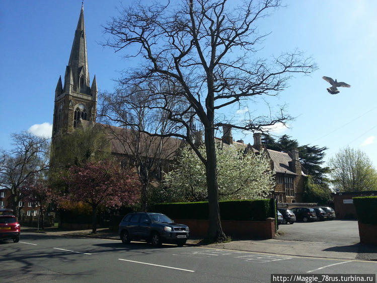 Композиция следующей фотографии очень жизненна: на переднем плане группа цветущих деревьев. За ними возвышается колокольня нортгемптонской церкви Св. Матью, воздух по-весеннему прозрачен, небо с высокими облаками, светло- голубое... не понятно только: то ли голубь, расправив крылья, летит орлом, то ли это святой весенний дух...