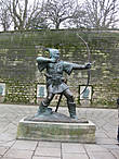 Увидеть места, связанные с Робин Гудом, мы отправились в один из выходных марта. Естественно, путь наш лежал в славный город Ноттингем, где есть целый район, названный именем Робин Гуда и знаменитая фигура благородного разбойника работы скульптора Джеймса Вудфорта. Английский скульптор изобразил Робин Гуда с натянутым луком, который тот направляет в сторону Ноттингемского замка. Автор монумента не забыл и о его веселых спутниках: сцены из жизни Маленького Джона и других друзей Робин Гуда…