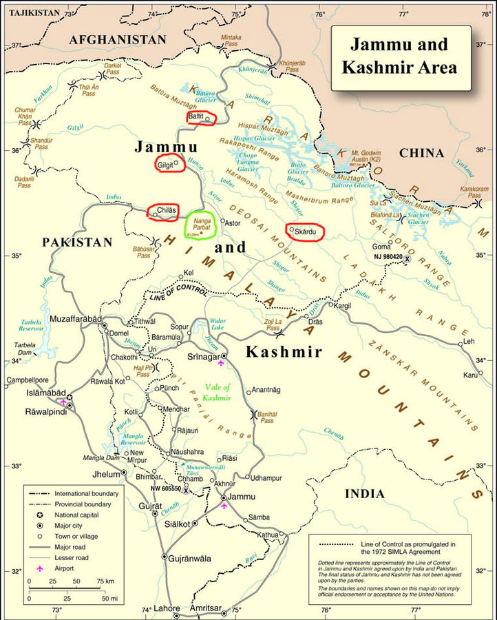 5. Ооновская карта Кашмира. Красным выделены города, зеленым – Нанга Парбат. В Гилгите и Скарду есть аэропорты