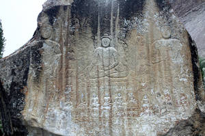 На фронтальной и боковой гранях скалы три фрагмента текста на тибетском языке. Полностью расшифровать их уже невозможно, так как надписи существенно повреждены. Если не ошибаюсь, тексты появились позже изображений лет на 100-150. Исследователи отмечают, что писали их разные скульпторы-резчики и, видимо, в разное время. Два текста выполнены красной краской, при этом, исходя из написанного, можно предположить, что и сами скульптуры были цветными.