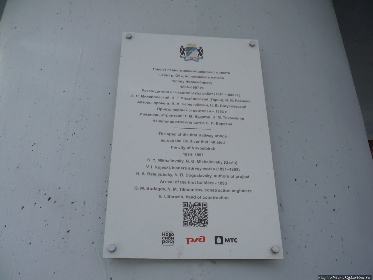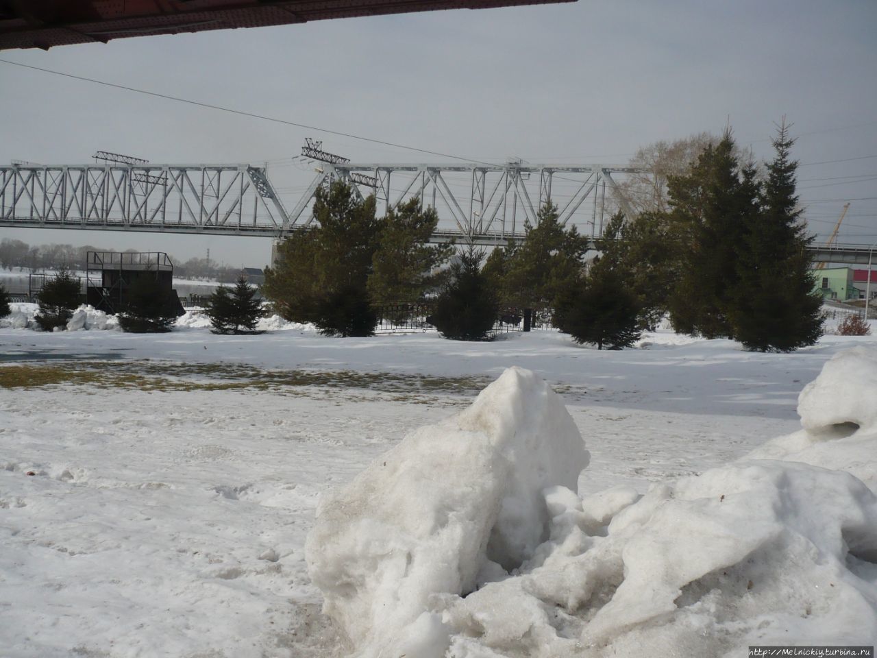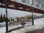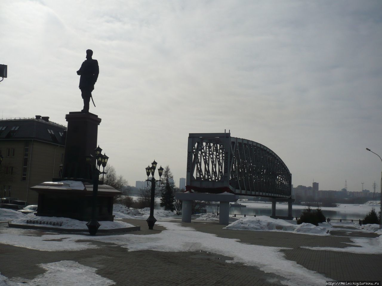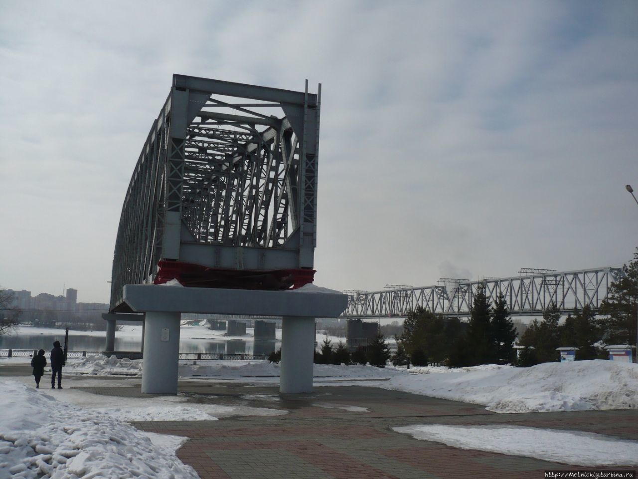 А за памятником императору есть еще один памятник – пролет первого железнодорожного моста через реку Обь. Мост был возведен в 1897 году по проекту петербургского профессора Н.А. Белелюбского. Он состоял из девяти пролетов, один из них был взят за основу монумента.