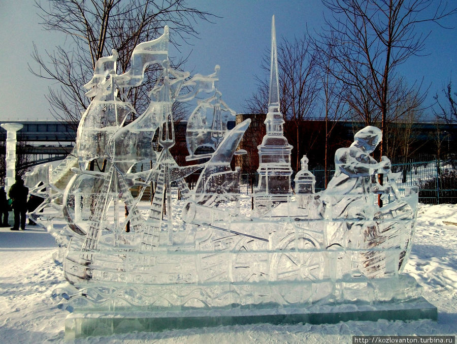 В канун Нового года на набережной у Речного вокзала в очередной раз раскинулся ледовый городок с самыми разнообразными горками, лабиринтами, скульптурами и прочими прелестями зимнего досуга. В отличие от Новогодних елок, которые завершают свою работу к середине января, этот городок будет работать до тех пор, пока не растает. На сей раз посетителям ледового царства предлагают очутиться в граде Петра, но только на берегах Оби.
