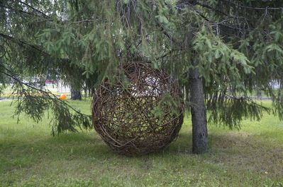 Названия данной работы я не увидела, но этот шар, как мне кажется, не что иное как «клубок событий», в котором странным образом все переплетено.