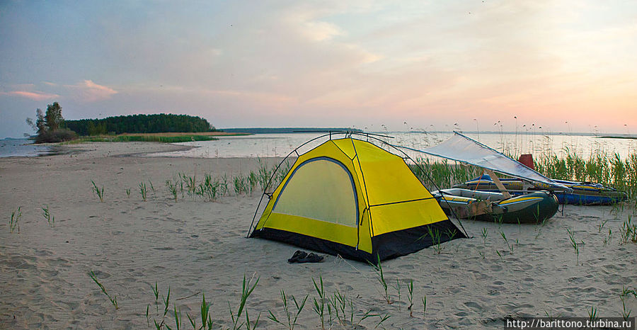 В первый день, как и планировали, прошли совсем не много. Задача была построиться на берегу и переправившись на один из Пичуговских островов, встать на стоянку. Так и случилось. Вечер был тихим, безветренным и друг на байдарке быстро исчез из виду, я же долго еще работал веслами до густых сумерек, прежде чем достиг выбранного им места. Что делать, ходкость байдарки и надувной лодки несопоставима и лишь попутный ветер может сровнять наши скорости.