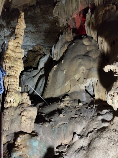 Доставляют туристов в пещеру по железной дороге. По ощущениям кажется что едешь в метро, только размер вагончика маловат.