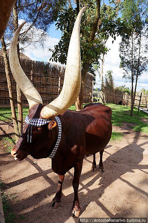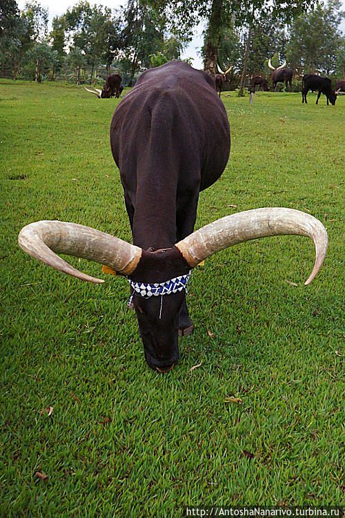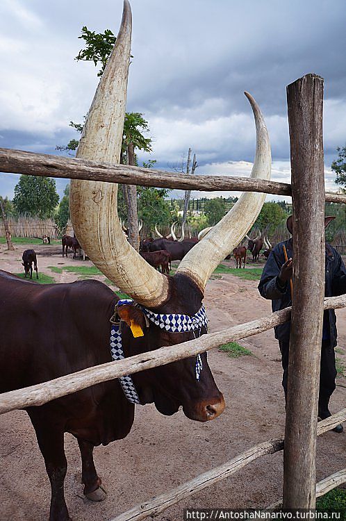 Эти буйволообразные рогастые коровы – традиционные руандийские, их тут разводили испокон веков, и они всегда считались коровами аристократическими. По-местному они называются “иньямбо” (inyambo). Но в наше время их мало осталось, так как молока они намного меньше дают, чем коровы обычные (хотя, говорят, оно полезнее обычного-то), а в Руанде молоко любят, чай тут всегда с молоком пьют. А я даже вначале подумал, что в стаде одни быки, настолько вымя у них маленькое, что я его и не заметил. А раз вымя маленькое, то, понятно, что и молока много из него не выдоишь. А зато рога – во, какие! Вах, не рога, а загляденье!