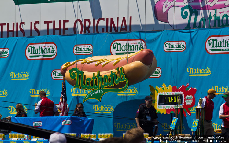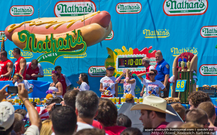 13. На фасаде ресторана Nathan's висит табло: отсчет времени до 4 июля, а значит и начала турнира и текущие рекорды. Нижнее табло: слева женский рекорд и имя, справа — мужской и имя чемпиона. Внизу, под рекордами слева от парня с ирокезом — там самая американка из Южной Кореи — Соня Томас, а парень с чемпионским поясом справа — Джоуе Честнат — чемпион среди мужчин