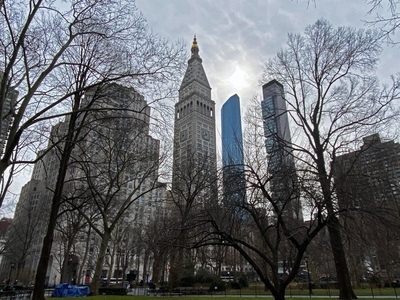 Конец февраля — еще не весна в Нью-Йорке. хотя трава и зеленая, листочки на деревьях еще не появились. Зато сквозь голые ветви деревьев хорошо виден архитектурный ансамбль площади.