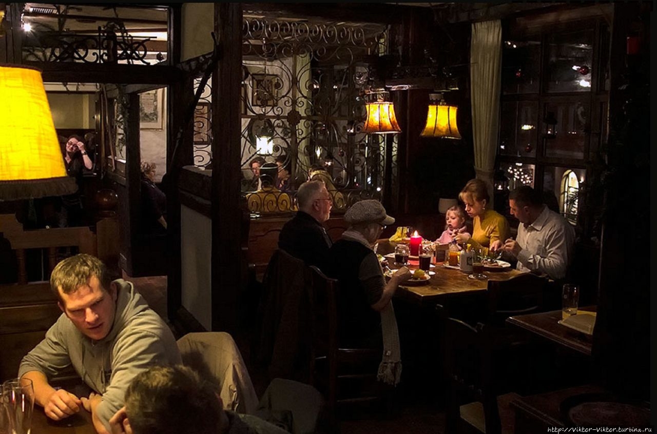 Дюрера мы зашли поужинать в этот ресторан и многочисленные положительные отзывы о нем на сайте Tripadvisor полностью подтвердились. Как оказалось, ресторан Wirtshaus Hütt'n пользуется популярностью не только у туристов, но что показательно — и у местных жителей. По-немецки колоритное и стилизованное под старину помещение разделено на уютные закутки на один-два стола с удобными широкими деревянными лавками со спинками. Практически все столы были заняты, но официанты в национальной баварской одежде смогли найти для нас троих свободное местечко.Нюрнбергский ресторан Wirtshaus Hütt'n