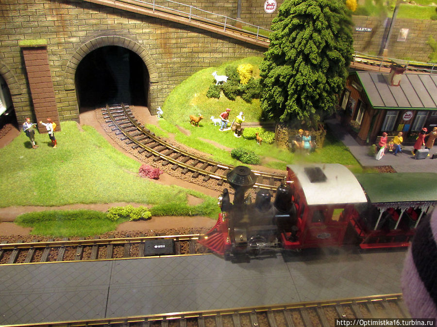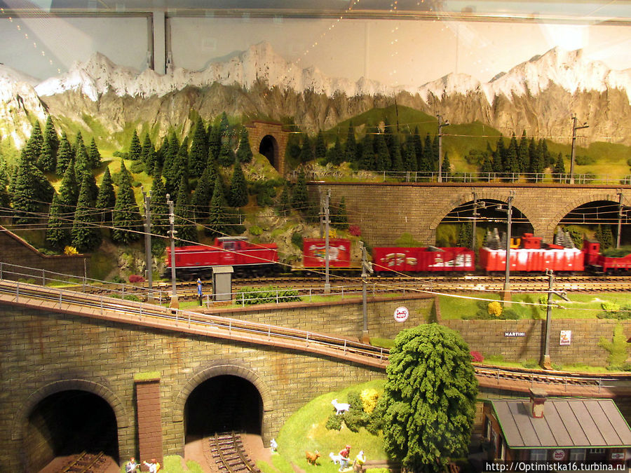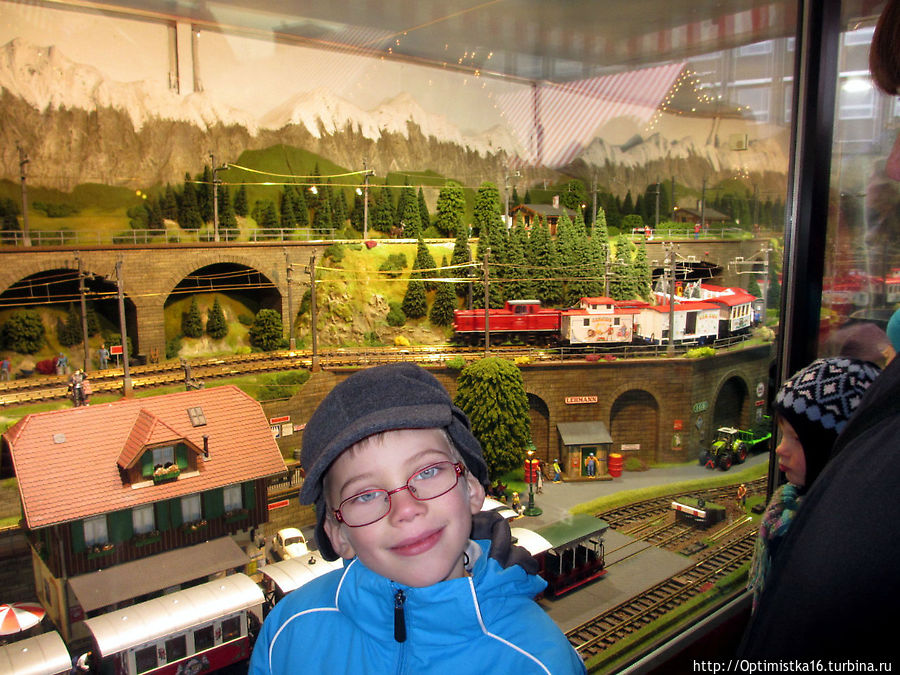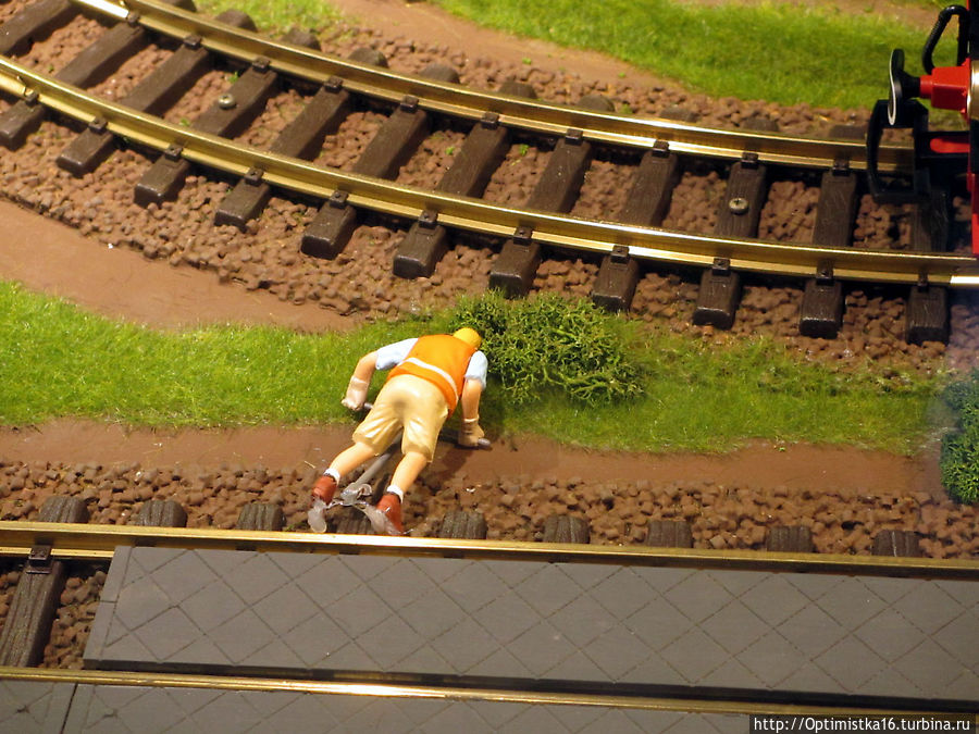 А потом мы пошли смотреть макет железной дороги. Здесь всё двигалось, работало, а один рабочий, по-видимому, уже очень устал и упал.