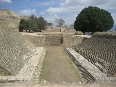 Монте-Альбан. Южная платформа. Ч.60) мы идем на выход, придерживаясь правой стороны, и к северо-востоку от центральной площади обнаруживаем очень хорошо сохранившуюся площадку. Это поле для игры в мяч (Guego de Peloto Grande). Здешний стадион нестандартен для Мексики, он имеет четкую форму латинской буквы I и небольшой размер. Кроме того, здесь отсутствуют каменные круги, выполняющие функции кольца.Рядом, судя по схеме, имеется пирамидальный храм, памятник P, дворец и Курган Q. Это говорит о том, что эта игра была предназначена для элиты города Монте-Альбан, как и в других местах Мексики. Каменные террасы были частью поля, а не трибуны, зарезервированные для зрителей.