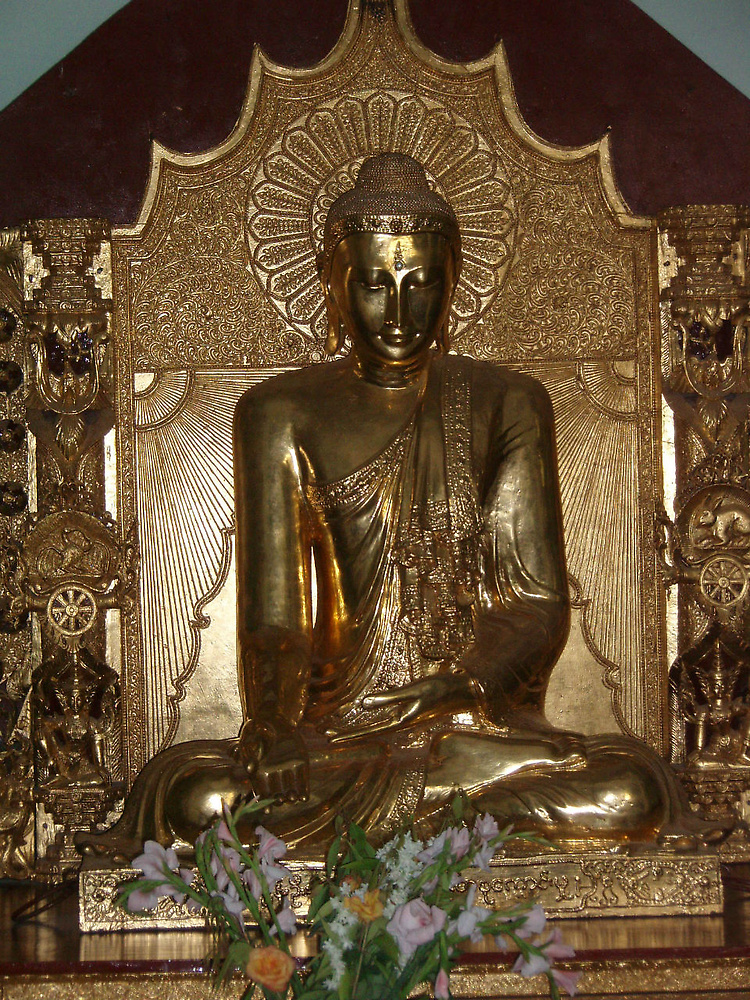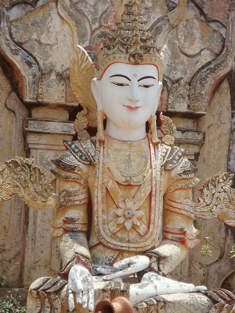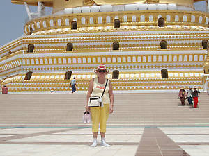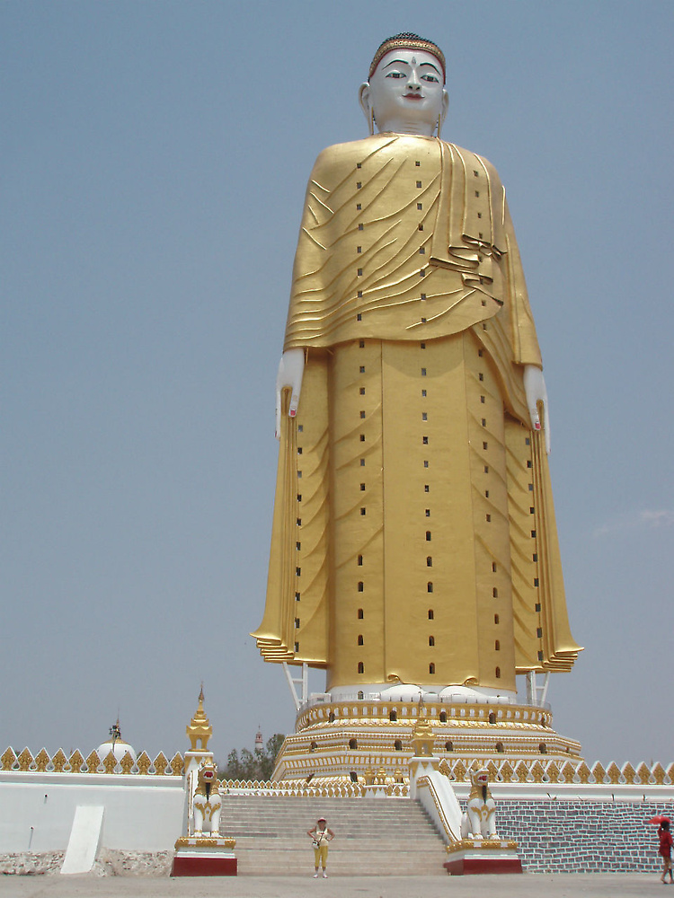 Пьедестал состоит из двух ступеней, основная восьмигранная напоминает ступенчатую усыченную пирамиду, на ней овальная, на которой установлена статуя. Вокруг целый комплекс разных фигур меньшего размера: сидящих рядами, на слонах, в тени деревьев под зонтиками, возле пагод и внутри священных стен. Золото пагод слепит глаза, белоснежные лестницы украшены фигурами змеев ( похожи на Нагов с мексиканских пирамид! ).