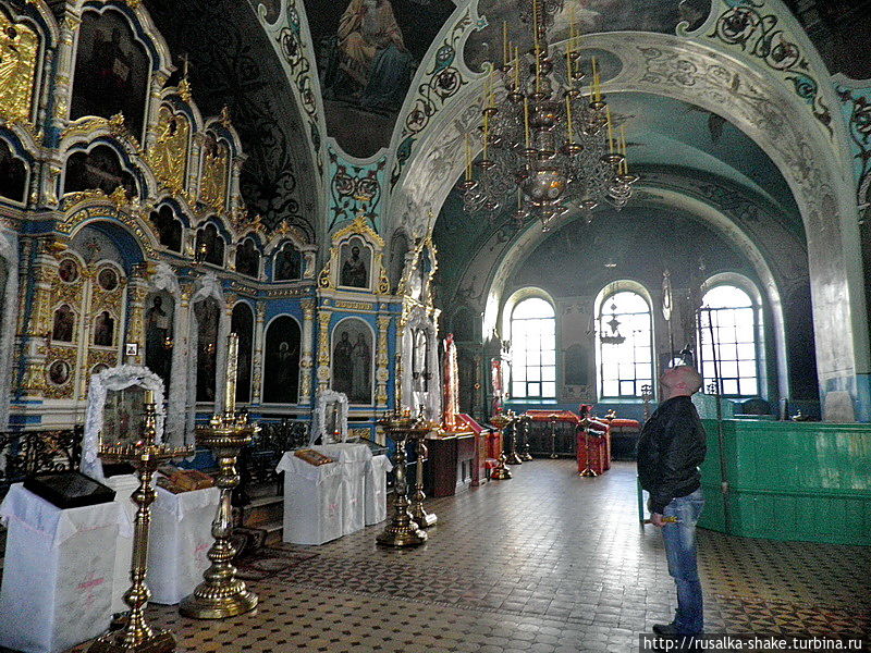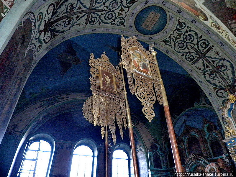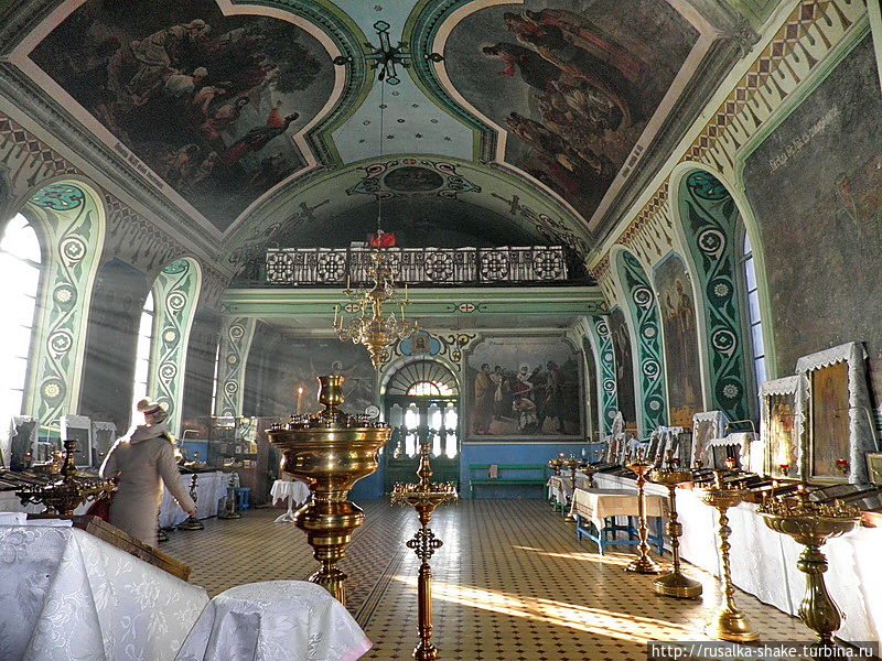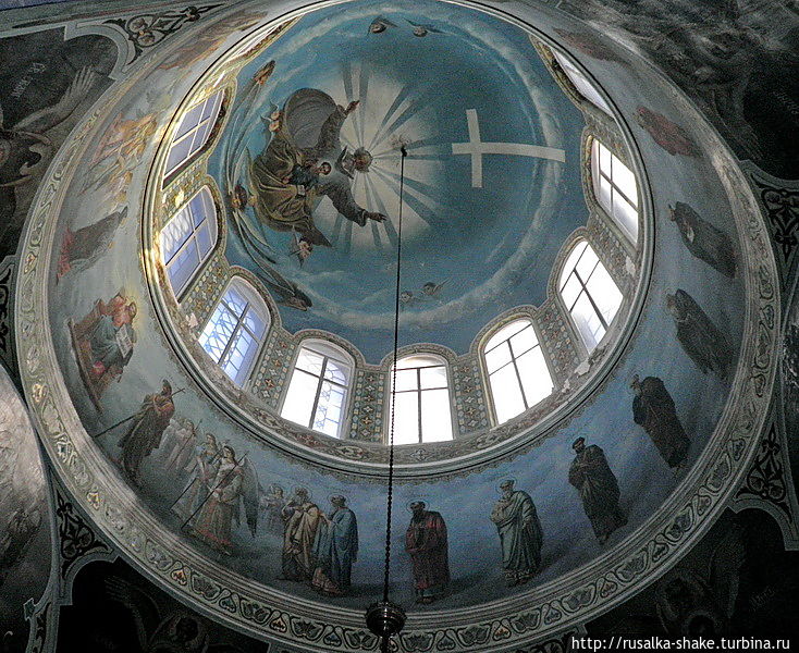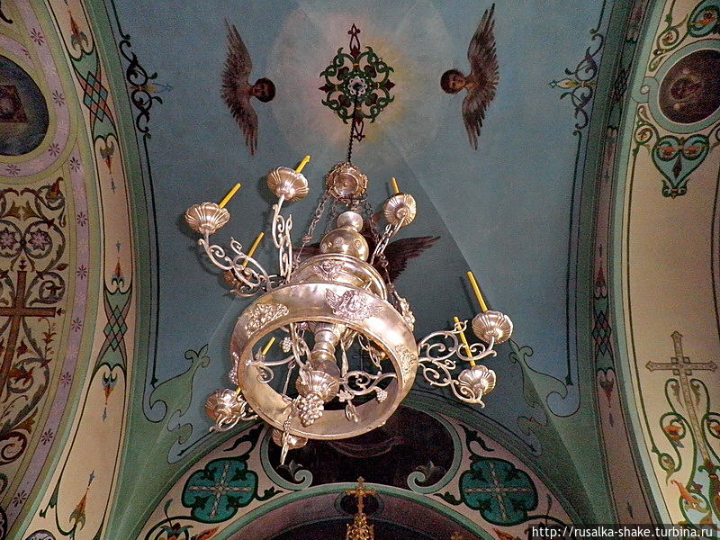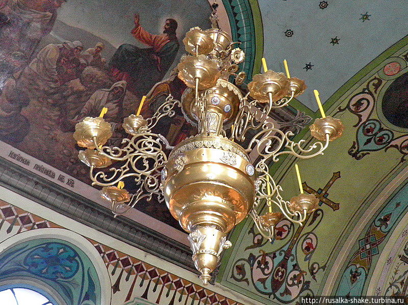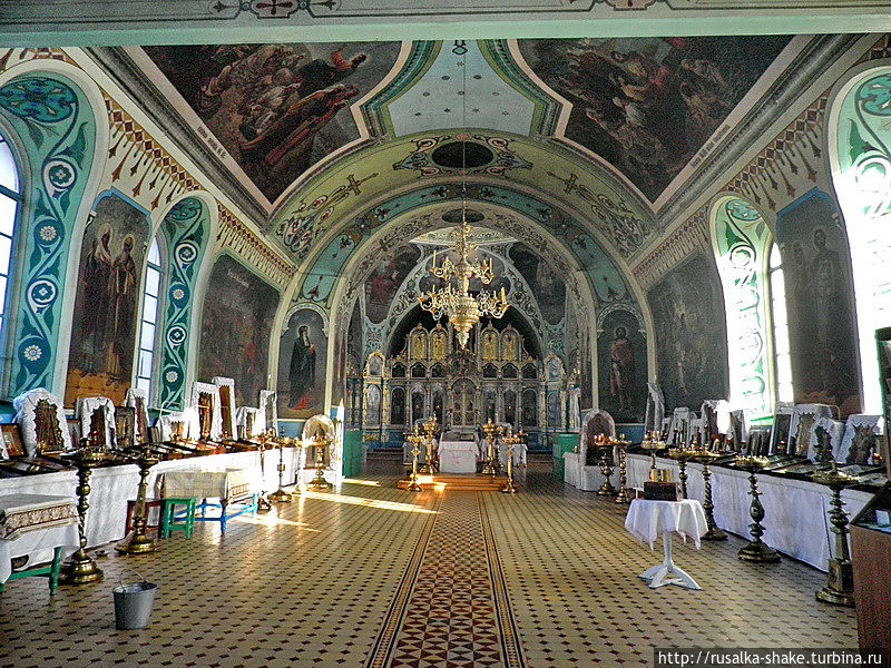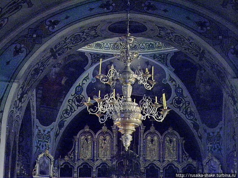 А какая благодать внутри! Пояса орнамента, росписи (сцены из Библии, лики святых, выполненные в явно светском духе) напоминают Васнецова, Нестерова и даже местами Репина; множество икон различного времени, трёхъярусный иконостас, сияющий позолотой, старинная изящная люстра (свечи другой люстры – более богатой, но не старой, – во время служб, встав на стремянку, зажигает служитель – где ещё такое увидишь)...