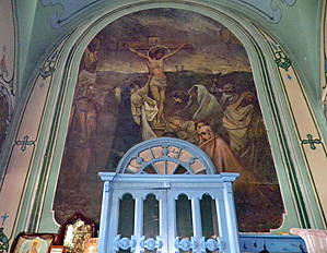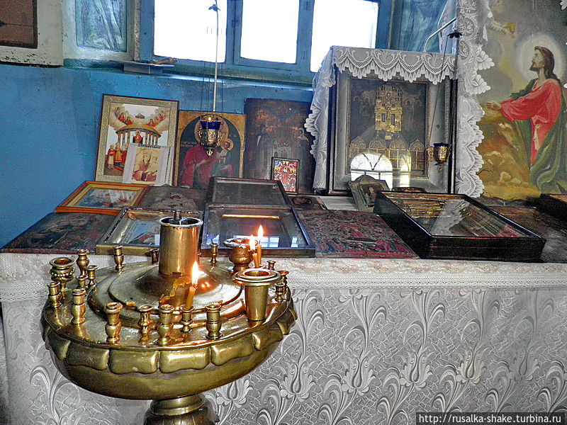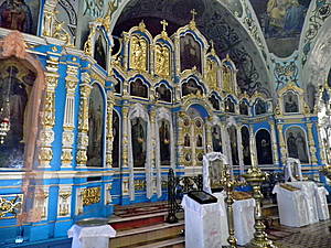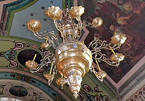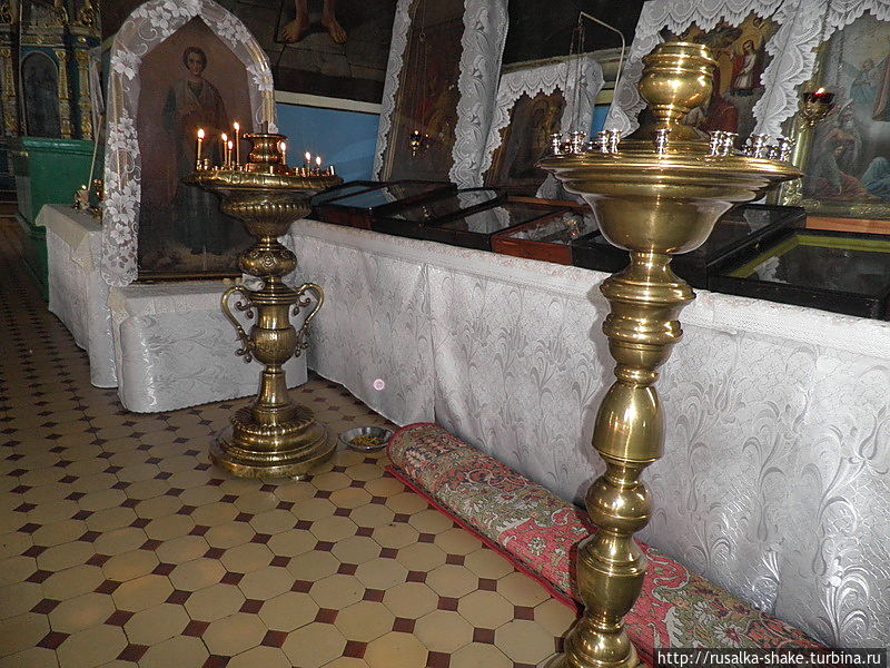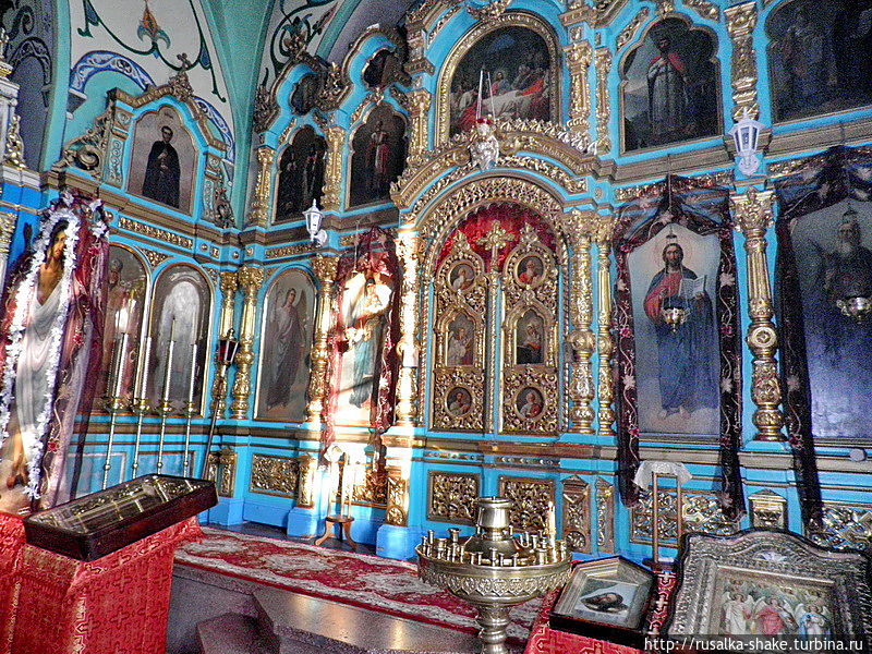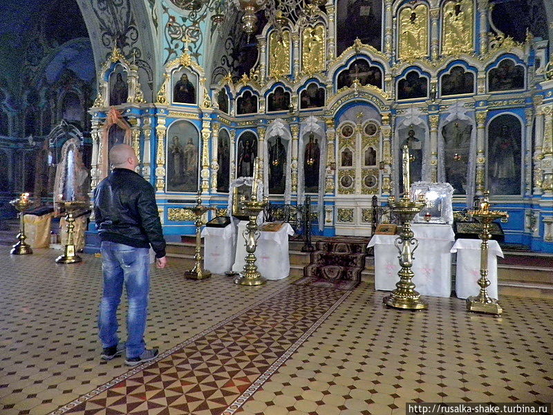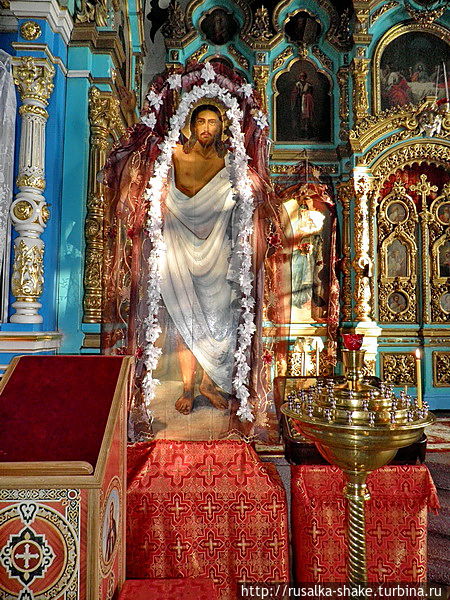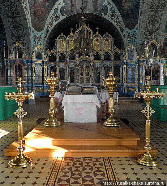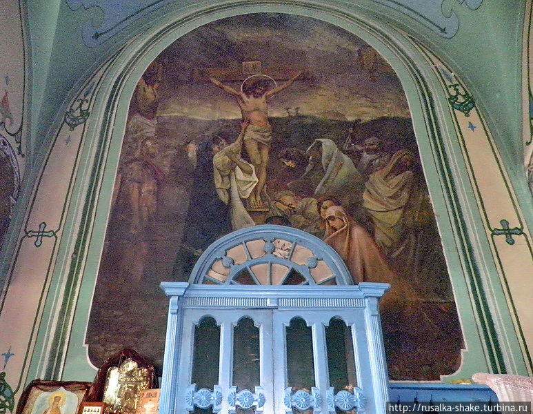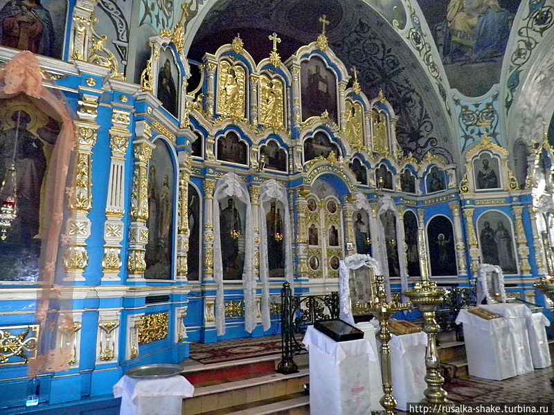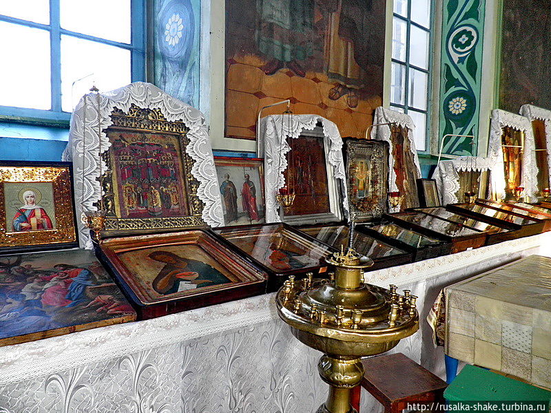 А какая благодать внутри! Пояса орнамента, росписи (сцены из Библии, лики святых, выполненные в явно светском духе) напоминают Васнецова, Нестерова и даже местами Репина; множество икон различного времени, трёхъярусный иконостас, сияющий позолотой, старинная изящная люстра (свечи другой люстры – более богатой, но не старой, – во время служб, встав на стремянку, зажигает служитель – где ещё такое увидишь)...