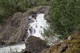 Утром принято решение радиально сбегать на водопад Valursfossen. Это немного назад по дороге и после входа в лес тропа уходит в сторону реки, потом разветвление на мост и на водопад. С первой точки где вообще видно водопад – видно всего чуть-чуть верхней части. Идем дальше, хотя времени в обрез, еще метров 400 и водопад видно целиком, а тропа идет дальше – видно это обходная тропа в Hjolmo.