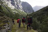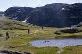 С утра немного сбились с графика и вышли в 9:30. Погода отличная на небе ни одного облачка. Идти нам сегодня совсем немного 13 км, до хижины Torehytten. Но мы хотим пройти побольше, ведь завтра нам предстоит 22 км., а с местной пересеченкой это немало. А еще сегодня хочется таки сходить на Хартейген (Harteigen), мы его уже два дня видим и он все ближе. Со старта выходим на небольшой пологий подъем, тропа петляет среди небольших плато, которые всего на 60-70 метров выше чем мы. Вот уже и домики Viersdalen. Быстро сегодня идется, тропа хорошая, камней почти нет, правда иногда встречается грязь, но и ее немного видно день без дождя все-таки подсушил почву. Почти сразу после домиков встречаем почти подряд две реки, где нужно разуться и перебродить. Точнее первую таки можно перепрыгать по камням, а вот вторую никак.