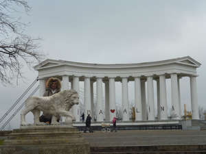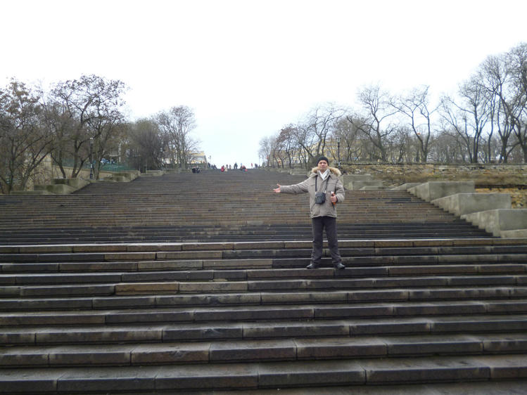 Вид на лестницу сбоку. Общее впечатление, слегка все в запустении. Чувствуется, что здесь не Киев. Провинция. Хотя по количеству достопримечательностей Одесса за пояс заткнет многие города. И не видели милиции совсем, и ГАИ нет. Видимо поэтому исторически Одесса вольный-бандитский город всегда был. Сосем не соблюдают правил водители и едут на красный. Дорогу на зеленый для пешеходов небезопасно переходить. Прям Египет. И все таки в Одессе классная атмосфера.