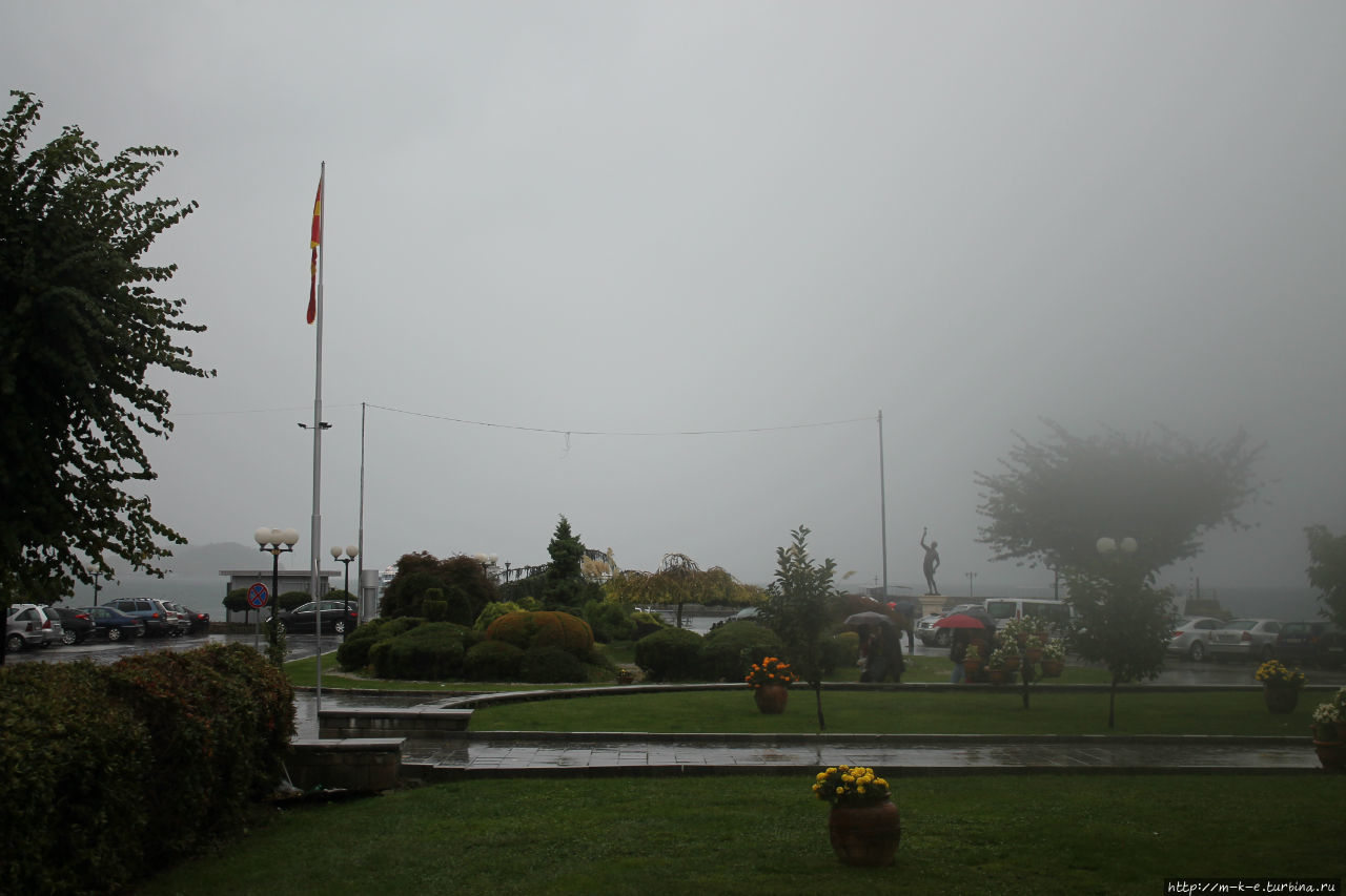 Путешествие в Охрид было непростым. Началось все еще на трассе в горах. Погода была к нам не очень благосклонна. Поэтому дождь практически не прекращался, а на перевале к нему еще добавился туман. Под его аккомпанемент я и въехал в город. Вот мои первые кадры с набережной.