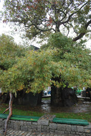 С набережной по вымощенной мрамором улице Святого Климента Охридского входим в город. Повсюду сувенирные магазины, кафе и рестораны. Оно и понятно город живет туризмом. Слева узкие кривые улочки устремляются в гору. Чувствуется турецкое наследие. Первый объект из туристического маршрута — дерево, которому немного нимало 900 лет с хвостиком.Стоит оно на площади Старый Базар. Его ствол настольок огромен, что внутрь поместиться не один человек. На этой же площади мечеть Халвети Хајати Теќе.