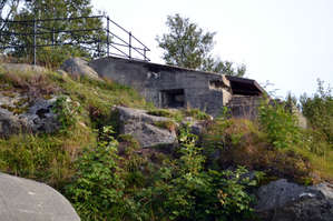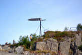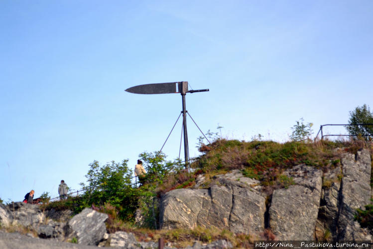 Но внимание привлёк необычный флюгер на вершине, обычно он выглядит как стрела, какой-нибудь петушок, а здесь как какая-то деталь от механизма. Решила посмотреть, но увиденное заставило забыть зачем я поднималась. Тропинка вела мимо бетонных сооружений, спрятанных в скалах. Оказалось, что это фашистские бункеры, построенные во время Второй мировой войны пленными русскими.