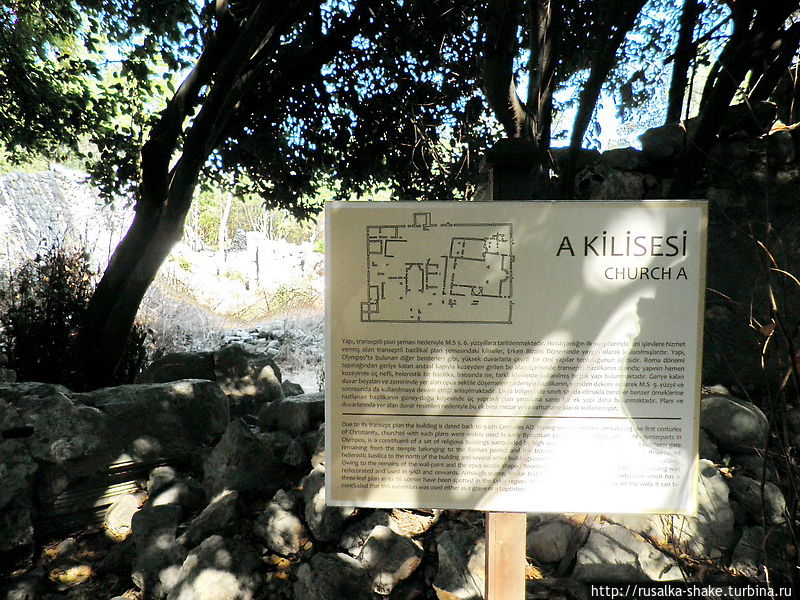 Руины Олимпоса, если можно так выразиться, малоухожены. Может, потому, что исторических памяток на турецком побережье Средиземноморья не счесть, и для раскопок, изучения и реставрации большинства из них просто руки не доходят. Может, из-за нежелания турок популяризировать недружественных им греков, их историю и культурное наследие. Но старинная мозаика, остатки акведука, громадного храма, церкви требуют, как минимум, защиты и внимания со стороны государства.